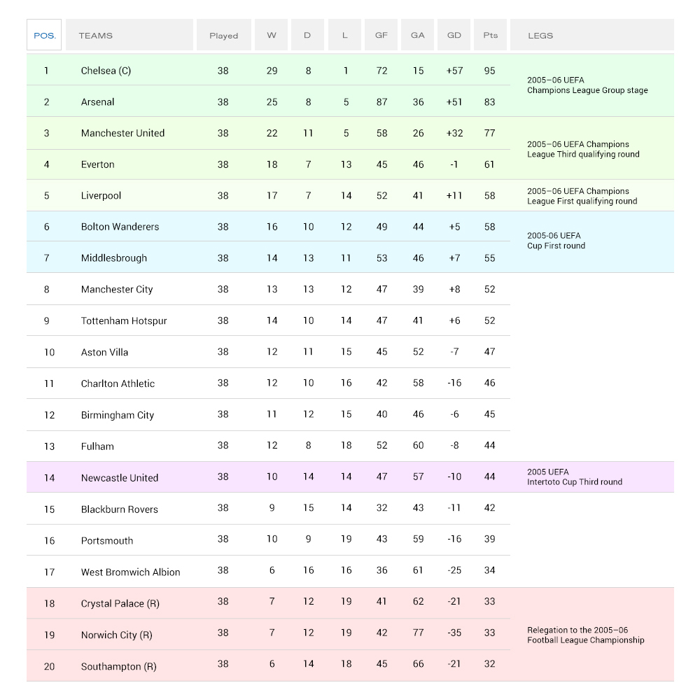 Chelsea won the title with a record 95 points, securing the title with a 2-0 win at The Reebok Stadium against Bolton Wanderers.